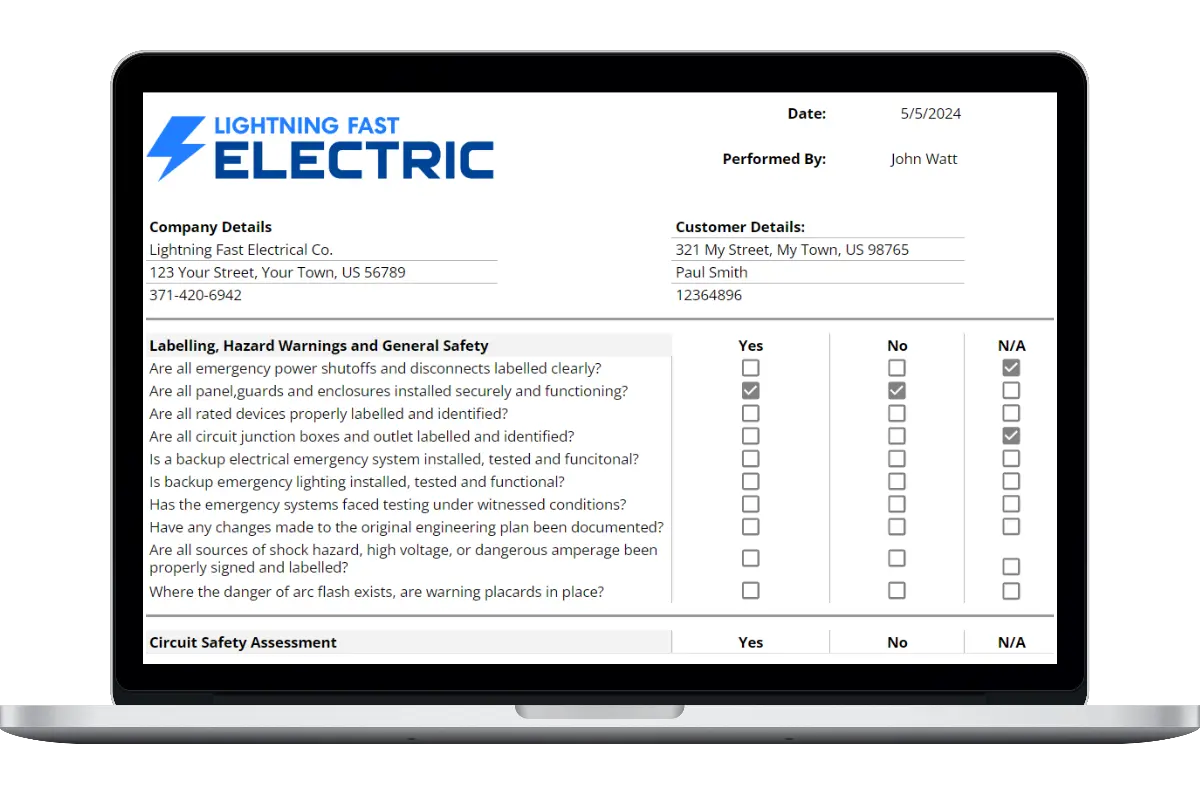 Creating accurate and thorough safety reports is essential for any electrical company. Having a simple, straightforward safety template makes it a whole lot easier. Our safety template features: