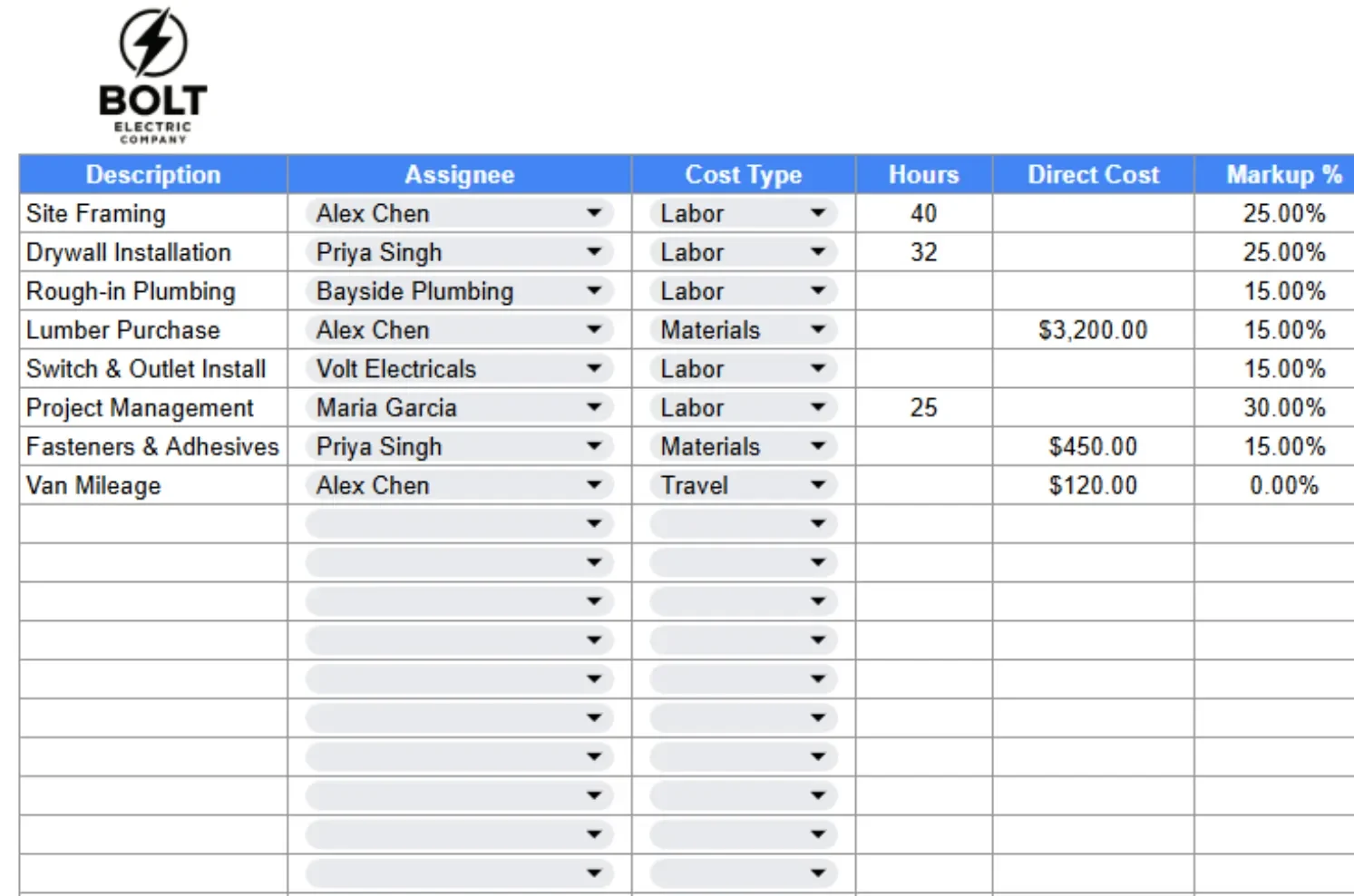 Our subcontractor and crew cost calculator template features: