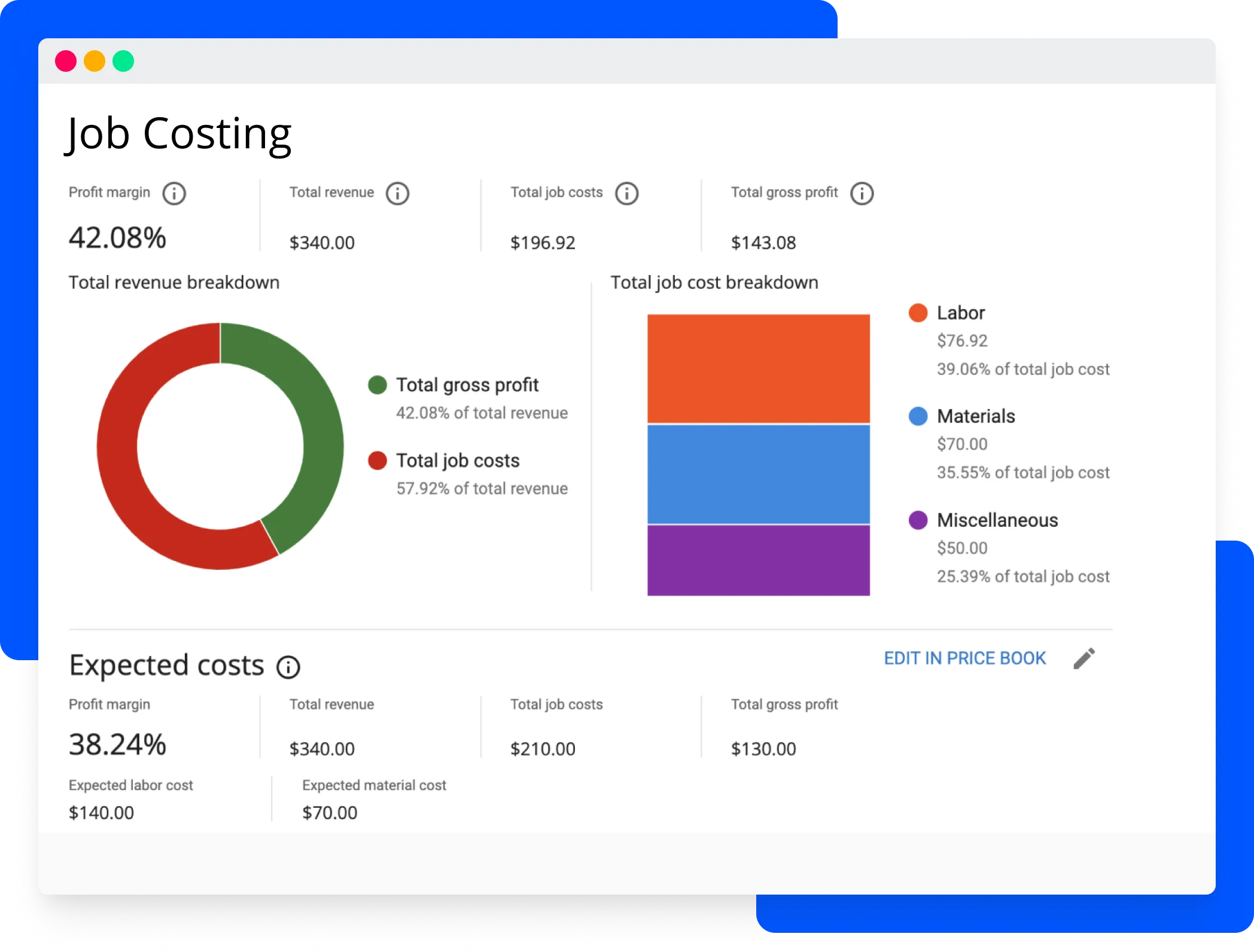 See profit margin shift instantly as you add labor, materials, or other job costs.