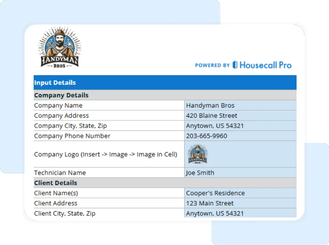 Step 1: Customize with Your Business Information Open your copied Google Sheet and go to the “Input Details” tab. Replace the placeholder logo and enter your company’s name, address, phone number, and email. Save this version as your master template to save time later.