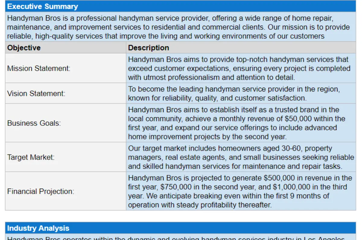 Creating accurate and thorough business plan is essential for any handyman company. Having a simple, straightforward business plan template makes it a whole lot easier.