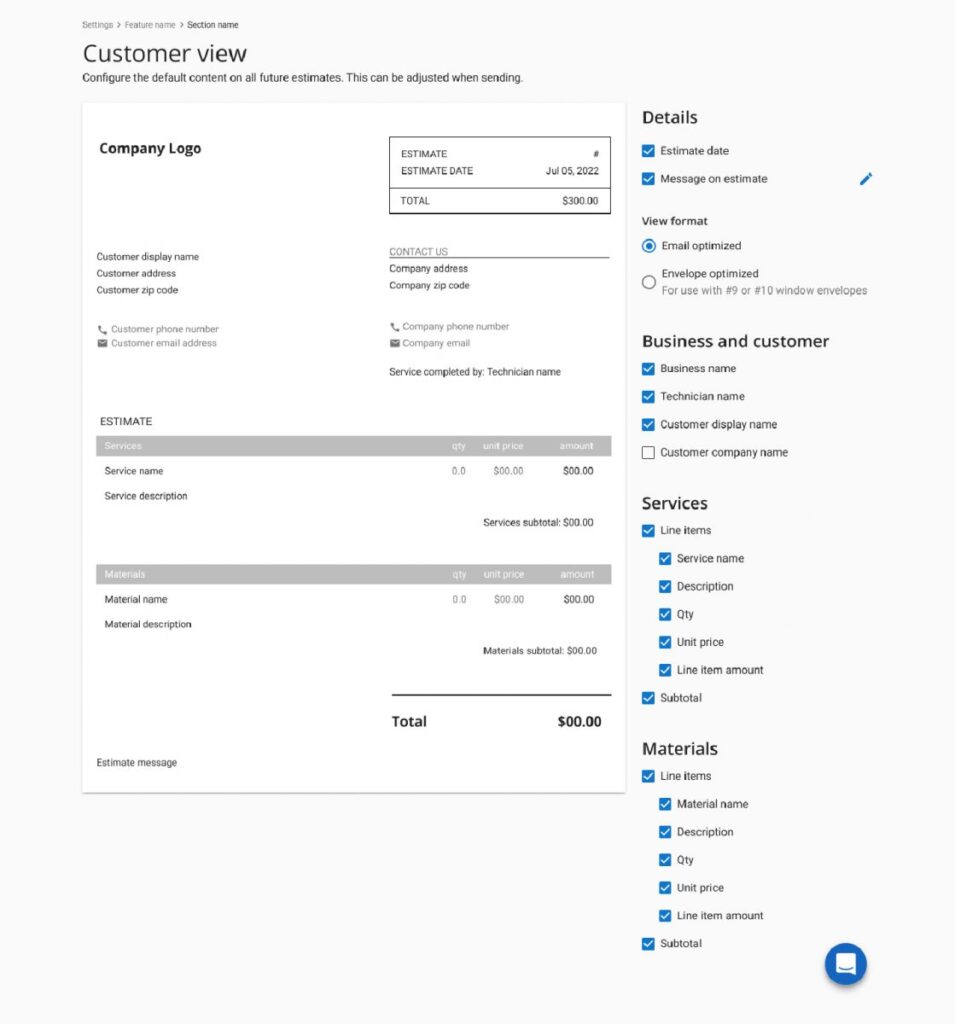 - New estimate settings for service and material line items that allow you to show or hide specific information including: business name, employee name, customer display name, descriptions, quantity, unit price, amount, and subtotals