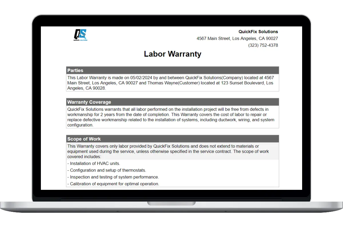 This labor warranty template is a quick and easy way to create warranties, keep job records and give customers peace of mind.